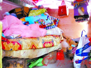 小窩棚里面有一個破舊的床墊,用木桶、磚塊等胡亂墊高。又臟又潮濕的被子等日常生活用品和阿婆撿回來的一些廢品雜亂地堆放在床上和底下,散發著一股難聞的氣味。