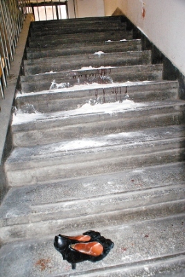 在匯通酒店4樓的樓梯間里,墻上和地上的血跡還在,旁邊的樓梯上,還散落著事發時萌萌穿著的皮鞋。