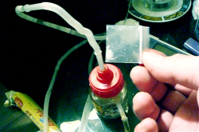 燈一打開,只見茶幾上擺著吃剩的生日蛋糕,3個用來吸食新型毒品的瓶子,臥室桌上也擺著瓶子,散落著大量的塑料吸管。之后,該房間的6男3女全部被帶回分局進行尿檢,證明均吸食了麻果。