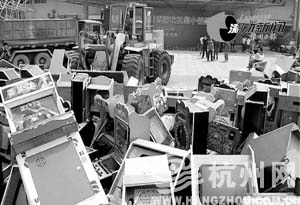 昨天上午,黃龍體育中心的西門口,3000多臺賭博游戲機堆積在此,很快,這些賭博機被鏟車砸得支離破碎,送上了垃圾車。