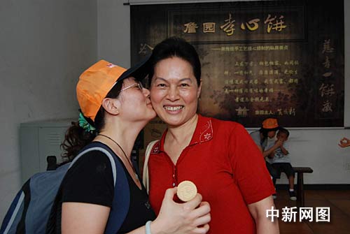 中新網廣州5月10日電(記者 莫非 通訊員 黃翠萍)“媽媽,我愛你!”在廣東中山詹園孝心餅制作大賽中奪得冠軍的劉女士給母親送上了深情一吻,也第一次送上了親手做的孝心餅,這讓劉媽媽笑開了懷。