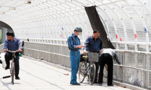 前天上午,記者在塘沽區史家莊鐵路天橋上看到,在一名推著自行車的婦女身前,一名六七歲的男童快步跑著。見到男童向地上擺放有光盤包裝的地攤跑去,后面的婦女快步推著車子向男童追去。當男童跑到地攤前時,婦女一把將他拉住說道:“快走,別瞎看。這不是你看的!