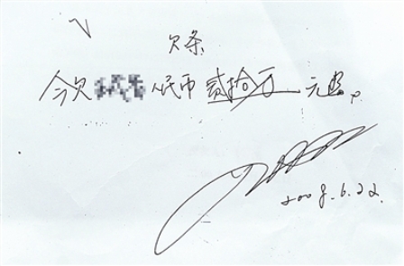 拿到錢后,雅暉寫了張欠條:“今欠老婆人民幣二十萬。”楚楚開始沒有細看,隔了兩天,又覺得不妥,找了個合適的機會提醒了雅暉一下,“他把老婆改成了我的名字,但是簽名是用的藝術簽名,一共有8條弧線,我實在沒認出來,不過我想以后都快是夫妻了,還計較這些干什么呢?”