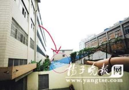 昨天上午9點多,記者接到報料后趕到現場,當時距離該名男生跳樓還不足半小時,受傷男生已被送到南京中大醫院搶救。據一位目擊該男生跳樓后情形的學校負責人介紹,當時他正在二樓辦公室看報紙,只聽見窗外“哐”的一聲響,抬頭一看,竟然看到一名男生砸在附近廠房的彩鋼瓦頂上,將彩鋼瓦頂砸出了一個大窟窿。所幸該男生沒掉到窟窿里去,人還趴在屋頂上,他似乎還有意識,本能地向屋頂上方挪動了幾下身體,這位目擊者還有附近樓上居民看到這情形,還叫那男生“別動別動……馬上叫人來救你!”那男生隨后就抓住了廠房屋頂的一根橫梁,就沒再動彈了!皬乃菚r候的表情看,肯定摔得不輕,連喊救命的力氣都沒了,當時替他捏了把汗,能保命是關鍵啊。”