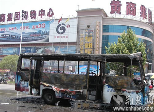 6月5日中午,黃岡市黃州區東門路黃商購物中心對面,一輛正在運行的公交車突然起火。黃州區消防中隊接警后迅速行動,未有人員傷亡。