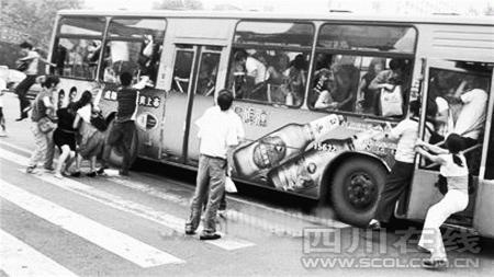 昨日上午8時左右,一輛8路空調車駛至成都萬年場公交站時,有位女乘客突然尖叫,車上大約60名乘客頓時慌作一團。司機迅速將車停靠路邊并打開車門,但仍有乘客打碎玻璃從車窗跳下“逃生”,1分鐘不到所有人全部逃離車廂。事后證明只是虛驚一場,所幸沒有造成人員傷亡。