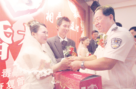 在鞭炮聲中,新郎們把身著婚紗的新娘接回康復所為他們免費提供的新房。之后,隨著婚禮進行曲響起,3對新人相挽著步入康復所內布置的婚禮儀式現場。廣東電視臺主持人侯玉婷為他們主持了婚禮儀式,廣東省戒毒管理局局長施紅輝為3對新人證婚。施紅輝說:“這是全國戒毒康復場所的首次集體婚禮。”