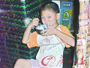 在石棉瓦窩棚的門口,一個留著短發(fā)、面容清秀的小女孩正捧著一個飯缽吃飯,不過小女孩卻被一根繩索綁著,繩子的另一頭拴在窩棚的柱子上。