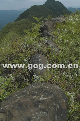 類似的排列巨石一直向東順著山脊兩側(cè)像長城一般蜿蜒近一公里,并且呈現(xiàn)出一定的排列規(guī)律:山崖南面堆砌的巨石體積巨大,且都是具有明顯的人工開采和打磨痕跡長方形或正方形石塊;而山崖北面的巨石幾乎都是未經(jīng)打磨過的石塊,呈不規(guī)則形狀,并且在堆砌時(shí)不及南面巨石那樣講究和規(guī)整,但同樣是一線排開。在山峰腰部茂密的草叢中,同樣有一些整齊排列的巨型方石,且山腰還殘留有人搭建的石階。