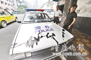 記者在現場發現,除渝A24796、渝A25718兩輛旅游大客車,停靠在長航公安局朝天門派出所門前的兩輛桑塔納警車同樣遭殃,擋風玻璃和引擎蓋上分別被人潑灑了一層油墨,地上還留下了油墨痕跡,呈點射狀。由于兩警車是出警車輛,派出所只好開進修理廠用專用清洗液清洗油墨。
