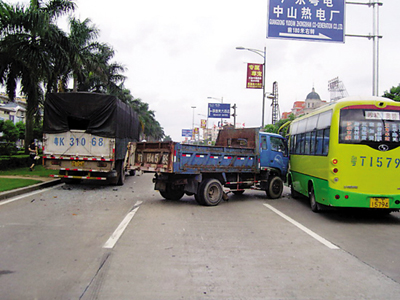 本月3日上午10時,一男子駕駛粵T/H45×9大貨車在南三公路三角路段由超車道變主車道過程中,被后面同在超車道行駛的粵K310×8大貨車撞上了左后角,之后,粵T/H45×9大貨車失控沖過主車道又與在慢車道行駛的粵T157×4購物免費接送車發生碰撞,事故造成購物免費接送車上的一名乘客骨折受傷,三車受損。