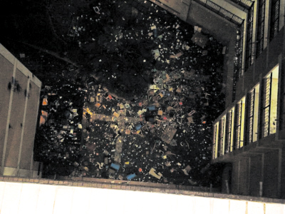 “還把寢室的桌椅也扔了下去!”“扁殼陽”說,他們甚至將放在樓道里的垃圾桶、地板磚也全部砸了下去。“熱水房的頂棚都被砸壞了。”“扁殼陽”稱,“畢業(yè)扔”在他們宿舍樓就持續(xù)了兩三天。