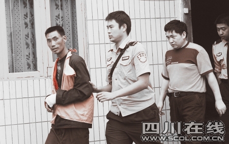 昨日中午12時,劉啟寬穿著彭州市看守所的衣服,戴著手銬,左手包扎著紗布,被警方帶回事發(fā)現(xiàn)場。他個子高高的,又瘦又黑,沒有穿鞋,始終低頭不語。就在劉啟寬指認現(xiàn)場的時候,其哥哥劉啟保也回來了。兩兄弟對望一眼后,都匆匆把視線移向別處。