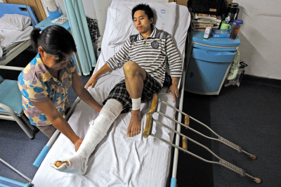 昨日下午,23歲的綦江男子楊傳華躺在重醫附一院骨科病床上,他的右腿打著夾板、纏著繃帶不能動彈。他說,7月2日早上,他在渝中區六店子小學旁邊的樹林里鍛煉,學校保安誤認為他是兩天前騷擾學校女老師的男子,將其腿打斷。至今,學校和保安未支付一分治療費用,也沒有來看望和向楊道歉。