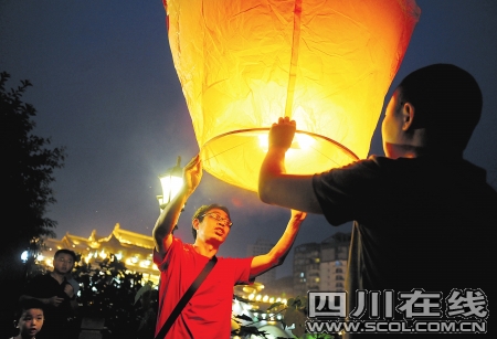 晚8點,合江亭邊天色還未全暗,“范跑跑”身著紅色T恤、休閑短褲和一群藝術家安靜地坐在竹椅上等候。8點30分左右,德籍華人藝術家蔡青招呼眾人,《祈愿》正式開始,范跑跑徑直走向安放孔明燈的紙箱旁。“我們的孔明燈是從臺北郵購過來的。除了要用孔明燈為地震逝者祈愿,還寓意海峽兩岸人對生命的尊敬。下面我和范老師將共同放飛孔明燈,愿意參與的市民都可以加入。”蔡青是此次活動的主要發起人,作為常年旅居國外的德籍華人藝術家,蔡青說多次前往映秀、北川等災區,大片廢墟令他很震驚。蔡青點燃孔明燈后,邀請“范跑跑”和他共同扶住燈的底框,將高達1米左右的孔明燈逐個放飛。