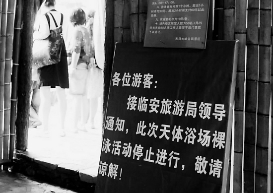 上周三,本報(今日早報)報道的《消隱5年后臨安“天體浴場”復出惹爭議》一文激起千層浪,一時間國內主要媒體紛紛轉載,新浪、搜狐、網易等還制作了專題采納網民意見——國內景區開辦“天體浴場”,你能接受么?按原計劃,修葺完備的臨安天目大峽谷天體浴場這個雙休日就將正式迎客。然而,浴場卻掛出通知,稱“天體浴場”所有活動停止進行,究竟是怎么回事?昨日中午,記者專程前往天目大峽谷一探究竟。