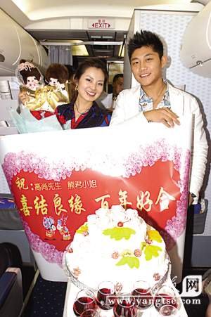 7月25日下午4:00,東航江蘇公司南京—北京的MU2831航班上演繹了一場長達15分鐘的空中求婚儀式。英俊帥氣的北京小伙子高尚先生和年輕貌美的南京姑娘熊君小姐無疑成了當日航班上最幸福的人。