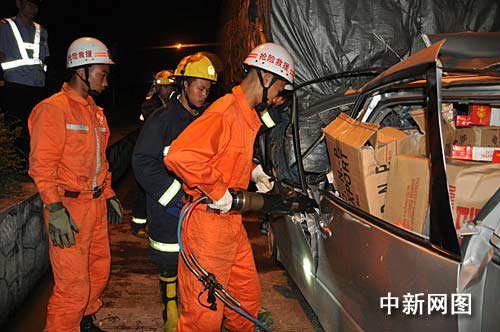 消防官兵隨后展開施救工作。由于車頭變形嚴重,消防官兵只得輪流使用消防撬棍、液壓剪擴器和切割機將兩邊的車門打開,然后將車上香煙搬出,再把兩人的座位靠背放直,兩名被困人員才得以依次抬出。經現場120急救人員證實,兩人已經死亡。