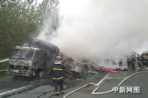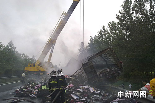 中新網(wǎng)南京七月三十一日電(衡中強(qiáng) 馬曲侃 朱曉穎)記者從淮安市消防支隊(duì)了解到,今日上午在京滬高速公路江蘇淮安市段九十三公里處一輛大貨車突發(fā)自燃,車上所載大量衣服和被套全部被焚為灰燼。由于火勢過猛,消防官兵用了兩個小時才將大火撲滅。