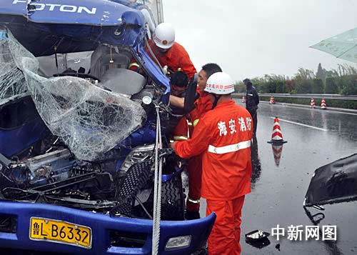 中新網南通8月10日電 (裘明明 王如海) 今天上午,江蘇南通沿海高速海安段兩輛貨車發生追尾事故,一名駕駛員被困,當地消防官兵淋著大雨成功將被困人員救出。警方提醒,近期受臺風影響,降水較多,廣大駕駛員朋友更要注意安全行車。