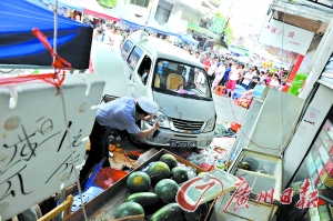 昨日下午1時30分,禪城平桂街的麗晶市場,一輛面包車發瘋似的沖進一個水果店,將路過此處的鄧松香老人撞飛幾米外,制衣廠女工阿玲則被碾在車下,面包車撞翻水果店,頂翻三臺冰柜,將老板娘胡金水從躺椅上撞下來。