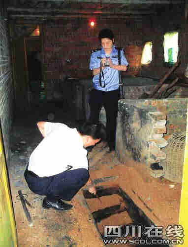 農戶王定平家四門緊閉,而屋后則堆積有七八噸煤炭。工作人員用鋼條、電筒等工具在屋內進行“地毯式”搜索。鋼條敲打王家廁所地面時,發出了空響;刨開地面上堆積的煤灰,下面是一塊長條形水泥板;揭開水泥板,一個能容一人進出的煤洞,出現在眼前。