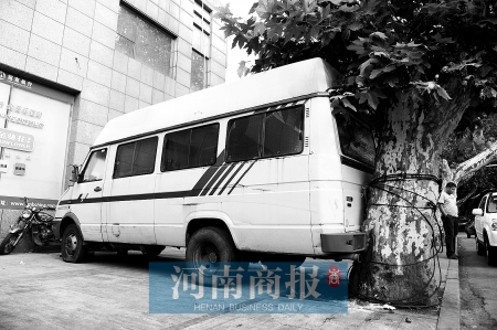 鄭州一輛依維柯客車“卡”在人行道上的一棵樹和墻之間,堵住了人行道。附近居民說,這車已經半年沒人開了,停得這么牛,真想問問司機是咋停的。