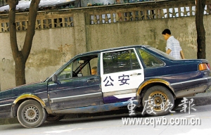 昨上午,記者在天臺崗小學附近,找到了這輛車牌為渝AY1069的“警用”桑塔納。因車身實在怪異,吸引了不少路人觀望,但駕駛員卻毫不在意。記者上前攀談,自稱二手車販的駕駛員爽快的道出了雷人“警車”的來龍去脈。最近,他收購了這輛有11年車齡的桑塔納,因車況太差,只好找了一些舊車部件更新,其中就包括這兩扇來自報廢警車的車門:“現在停在這里,正是因為水箱過熱!