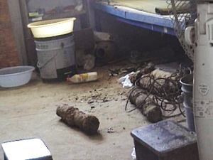 昨天中午12點左右,一個收廢舊的來到這家工地,說是收廢舊,其實是想收點文物,因為工地經常能挖出些瓶瓶罐罐的。一個民工說他有好東西,就把收廢舊的帶到了宿舍,從床下掏出個銹跡斑斑的東西,說這些陶罐能值多少錢啊?收廢舊仔細一看,哪里是什么陶罐,明明是枚炮彈,而且床下還有3枚。乖乖!敢情前天一夜我們都睡在炮彈上,同宿舍的民工都炸了。工地的安全員趕到,立刻報警。不久警察趕到,封鎖了現場,并通知了排爆大隊。這4枚炮彈長約40厘米,直徑約20厘米,這位民工說是前天夜里施工時,挖土機挖出來的,他以為是陶瓷罐,就放在了床下。警察說炮彈里是有火藥的,但因為銹得嚴重,還辨認不出是什么炮彈。這些炮彈很不穩定,雖然很少爆炸,但遇到高溫或撞擊就難說了。下午1點鐘排爆大隊趕到,將炮彈帶走。 (吉啟雷)