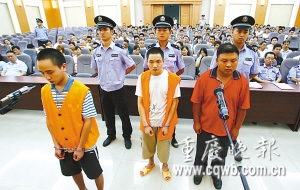 昨上午,南岸區(qū)人民法院審判長(zhǎng)敲響法槌:“請(qǐng)值庭法警帶被告人吳貴平、傅顯國(guó)、吳成中到庭。”