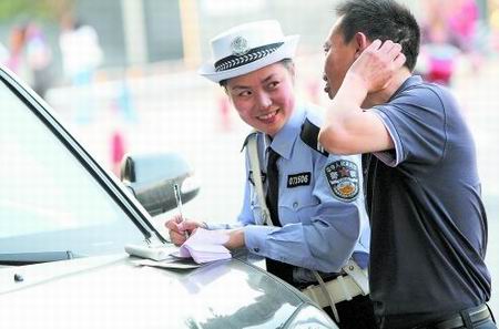 12 時許,胡玲準時出現,路口兩側的七八名市民頓時激動起來,“她就是‘溫柔一刀’嗦,真的很漂亮哈……她笑起來好親切哦!”聽到有人議論自己,胡玲臉一下子就紅了,她微笑著向路人點了點頭,開始了執法。不到10分鐘,兩輛違法調頭的小轎車被她攔了下來。在胡玲處罰違法司機的過程中,長順街對面等候紅燈的車流中,也有司機投來關注的眼光,不少人在微笑著沖著胡玲指指點點。