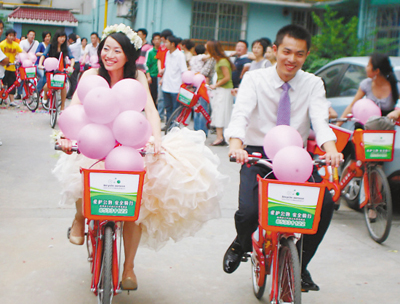昨天,一支飛揚著彩色氣球的公共自行車隊,在西湖文化廣場集結。新郎麥田與新娘小A騎公共自行車步入婚姻殿堂。