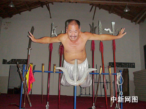 中新網永春10月12日電 (林永傳 顏堯民 施由森)以腹部作為支點,雙腳支在鐵欄上,然后整個人身體懸空,普通人一般無法做到這點,而福建永春縣白鶴拳師顏大石卻可以以鋒利的鋼叉作為支點,整個人懸空,其白鶴內功令人叫絕。