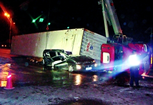 據有關部門介紹,昨日凌晨2時15分許,司機袁龍駕駛一輛內蒙古牌照的集裝箱式大貨車,由密云縣前往遼寧省沈陽市運送貨物。途中,該車經通順路,由北向南行駛至順義區通順路米各莊路口時,與一輛西向東駛來的現代商務轎車相撞。其間,貨車司機袁龍向左打輪躲閃過程中向右發生側翻,將商務轎車壓在右側貨箱之下,造成轎車內人員全部被困。