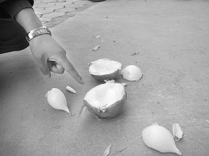 當記者趕到現場時,楊先生已被120急救車拉往醫院檢查治療。在這棟居民樓下,一個被砸成四分五裂的洋蔥,仍留在地面上,據目測,這個洋蔥的直徑至少在10厘米以上,重量也差不多有500克。