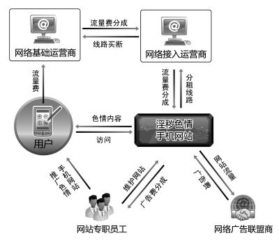 公安部門相關人士表示,基礎運營商也是“手機色情”網站的重要受益者。按照目前的運營體制,手機瀏覽色情網站產生的費用將首先上繳給基礎運營商,再由基礎運營商按比例給下線承包商分成。這意味著,流量越大,受益越高。