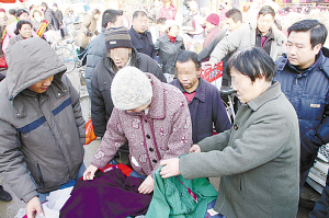 在一個小攤兒上,一位老大媽看上了一件毛衣,正在討價還價,先前的兩個老人擠了上來。老漢擠住買毛衣的老大媽,老太太左手抓起一件毛衣作掩護,右手伸進了老大媽左側的口袋,把錢掏走了。