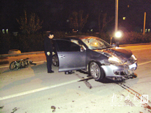 昨天凌晨,一輛大眾速騰轎車行駛到南京揚子江大道定淮門大街路口附近,突然將一名騎助力車的保安撞飛幾十米外,保安不治身亡,助力車被卡住拖行,轎車滑行幾十米后才停下,而開車男子自稱當時時速為70公里左右。事發后,目擊者稱肇事司機兩次在路邊嘔吐,且聞到一股酒味,面對眾人詢問,肇事司機否認喝酒。然而昨天下午,記者獲悉,男子因交通肇事被刑事拘留,此外還涉嫌酒后駕駛。