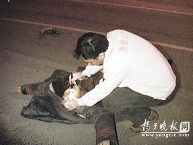 昨天凌晨0點35分,一輛由南向北行駛在南京揚子江大道上的銀灰色速騰轎車,在開到定淮門大街的路口時,突然將一名騎助力車身著保安制服的男子撞飛40多米外的車道上。頓時被撞保安不省人事。事情發生后,110民警接到報警立即通知了120救護車及交警五大隊到場處理。很快,民警臨時用路障將現場進行保護,此時,那名穿著保安制服的中年男子仰面倒在地上,這名保安是南京鼓樓區保安公司的保安萬德華。醫護人員將他抬上車就近送往南京醫科大學第二附屬醫院搶救。