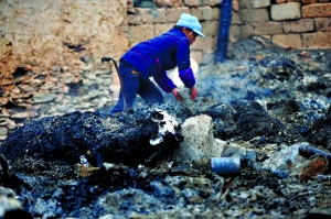 周華一家五口被呼救聲吵醒后,正站在自家的二樓。他們清楚地看到燃起的過程。“先是小小的火苗,看不清,接著騰一下躥起來,整個房子都在火光中了。”