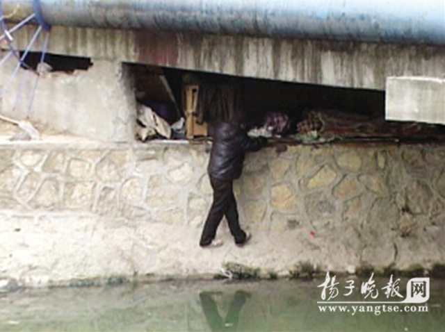 據(jù)了解,該落水男子是安徽人,在南京已經(jīng)好幾年了,平時(shí)靠打零工和收舊維持生活。記者在現(xiàn)場(chǎng)看到,他住的橋洞內(nèi)還住有其他民工,橋洞下塞了一排被褥。據(jù)周?chē)用裾f(shuō),老人落水時(shí),他們都在組織救人,而橋洞內(nèi)兩個(gè)年輕人還在呼呼大睡,再詢(xún)問(wèn)兩年輕人時(shí),兩人一臉茫然。他們睡的地方實(shí)際上是河道坡面上的一塊平臺(tái),空間極其狹窄。由于兩邊設(shè)有鐵柵欄,禁止人翻越的,但是他們進(jìn)出橋洞只能翻越柵欄順著坡面爬到橋洞內(nèi),稍有不慎就會(huì)墜入河中。(本報(bào)記者 任國(guó)勇 文/圖)
