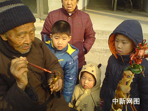 中新網偃師1月19日電 (記者 曹錚 通訊員 盧班)今日上午,在偃師電視臺東邊記者發現一耄耋老人正在為一年輕人制作“吹糖人”。