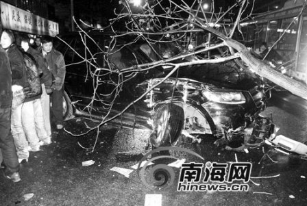 據目擊群眾介紹:當時這輛越野車從五指山路一單位開出來,越道沖到馬路對面“新香梅休閑中心”前的人行道上來。當時正在清掃馬路的一名女清潔工急忙閃到一邊,她清運垃圾的拖車被這輛越野車撞翻在地,車被撞散架,整車的垃圾全部倒了出來。接著,這輛越野車撞斷人行道上的一棵碗口粗的遮蔭樹,把停在人行道上2輛摩托車撞倒后,并沒有停下來,它沿著人行道往前沖,沖出50多米遠后,又在芳草園前面的人行道上撞破了一處墻角,撞倒了5輛停放好的摩托車,并把一棵碗口粗的遮蔭樹撞斷后連根帶走,還把路邊一位準備騎電動摩托車的男子撞飛。肇事車接著從人行道開到五指山路上后,汽車的右前輪拐斷倒向一邊,開不動后才停下來。從這輛肇事車上隨后下來幾名男子。交警趕到現場后,把肇事司機帶到了交警事故處理車上。那名被撞傷的男子隨后被120救護車送往醫院。