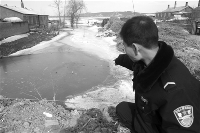 25日14時許,記者來到位于依蘭縣宏克力鎮東北方向的三義村,在村前路口轉彎處,記者見到一個寬約10米,長約40余米的條狀大坑,這里就是三個孩子出事的地方。此時的大坑水面上仍結著冰,但部分冰面已經破碎,水面上還冒著熱氣。大坑周圍已經圍上了繩索,一塊木板警示牌上面寫著“此處水深危險”,紅色的油漆還沒有干。附近的居民告訴記者,這塊木牌和攔坑的繩索都是今天早晨才設立的。