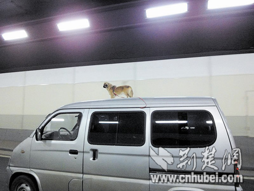 在一輛快速行駛的面包車的頂上,站著一只小狗。昨日,一組標題為“武漢長江隧道內虐狗門事”的照片出現在網上。