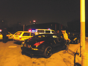 就在記者采訪的時候,4輛豪車又回到了奧體北門。大家停好車,紛紛下車抽煙聊天。記者急忙追了上去,只見在奧體北大門西側路面上,一字排開著4輛顏色不一的豪華跑車,車尾處留下了一道道長長的剎車痕跡,足見停車前的速度很快。4輛顏色不一的豪華跑車中,有三輛車子上沒有上牌照,有一輛車子車牌擋著。車上下來的都是年輕人,車手都是男的,每人身邊跟著一位大美女。車主們說這些跑車都是自己私車,個個都自稱是富二代,他們每個人所開的跑車都在80萬至100多萬之間,還不是最好的車輛。見此情況,記者立刻報了警,并拿出相機拍照采訪。