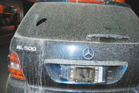 當晚7時許,記者聞訊趕到青年路交警蓮湖大隊時,一輛車身沾滿泥巴的黑色奔馳ML500越野車已被警車拖到交警隊的院子里,只見車前的引擎蓋和車身上分別寫有“倉庫門口請勿停車”和“傻、犯罪”等字跡,F場一位不愿透露姓名的交警告訴記者,這輛奔馳越野車正是被警方監控到涉嫌碾軋女警張昂胳膊后逃逸的可疑車輛,并透露可疑車輛當時停放在西五路一廢品站外,后經過大量調查取證,可疑奔馳越野車被交警蓮湖大隊拆卸掉前后車牌,隨后拖回交警隊。