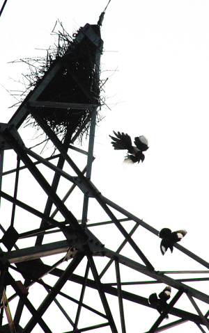 那是10天前,一對從異地飛來的兇悍八哥,竟然看好了高壓電線架上的這個窩,于是不顧里面正住著的喜鵲夫妻,悍然發動攻勢,沖著窩里叫喚,企圖強占。但它們遭到了喜鵲的防御,一時也無可奈何。
