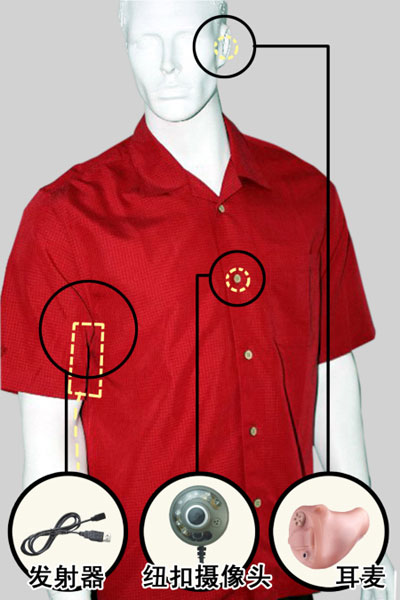 作弊考生進(jìn)考場前,要帶上電子遙控設(shè)備、米粒耳麥,穿上安裝有針孔攝像頭的衣服。