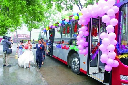5月16日清晨,一輛被裝扮一新的“公交婚車”從石家莊市駛往井陘。有過往市民在看到這輛引人注目的“婚車”后,忍不住發出感慨:“這比凱迪拉克當婚車還拉風啊。”而端坐在這輛公交婚車上的新郎趙欽,則一路幸福地盼望著迎接新娘。據介紹,此次婚禮的一對新人都是公交司機,以公交車當婚車既是因為對公交車有特殊感情,也是希望倡導低碳生活。
